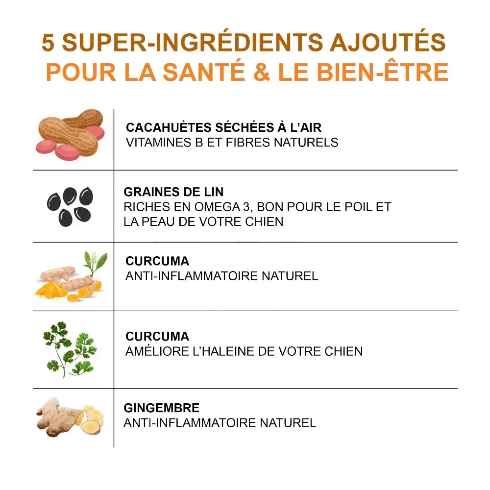 - 4 super ingrédients ajoutés : curcuma, huile de coco ou graines de lin, persil et gingembre