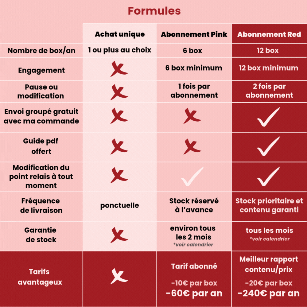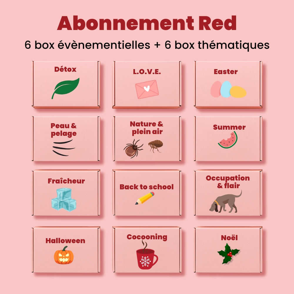 - Abonnement RED ❤️ : 12 box annuelles – les 6 événementielles + 6 box thématiques, environ une box tous les mois